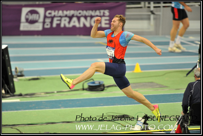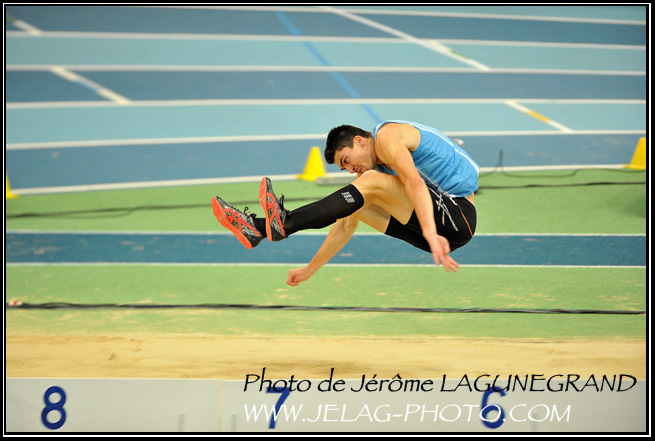 Bastien AUZEIL, dans un exercice de souplesse pour le ramené au saut en longueur à 7,98 m.